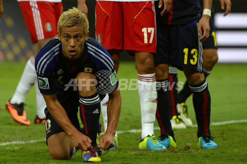 試合中にスパイクのひもを結び直す日本の本田圭佑(Keisuke Honda、2013年6月22日撮影)。(c)AFP/YASUYOSHI CHIBA