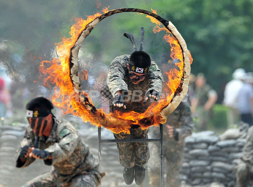 写真は、武術の技を披露する兵士ら(2013年6月22日撮影)。(c)AFP/JUNG YEON-JE