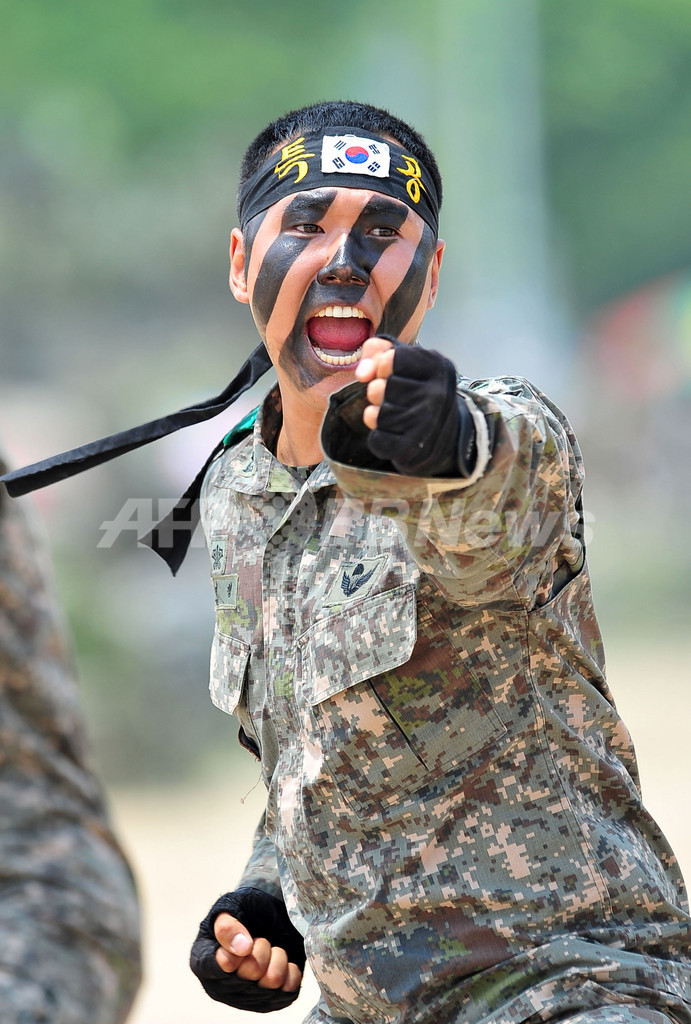 写真は、武術の技を披露する兵士ら(2013年6月22日撮影)。(c)AFP/JUNG YEON-JE