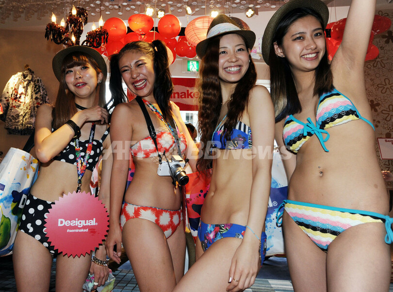 【6月24日 AFP】スペインのカジュアルファッションブランド「デシグアル(Desigual)」原宿店で22日、アジア初となる「セミ・ネイキッド・パーティー」が開催された。このイベントは、水着を着て来店した先着100人に店内の商品2点を無料でプレゼントするもの。店の前には約350人の列ができ、中には前夜から並んだ人も。開店を待つ間、集まった人たちは水着の上に店から提供されたバスローブをはおり、朝食として配られたチュロスや飲み物を楽しんだ。(c)AFP