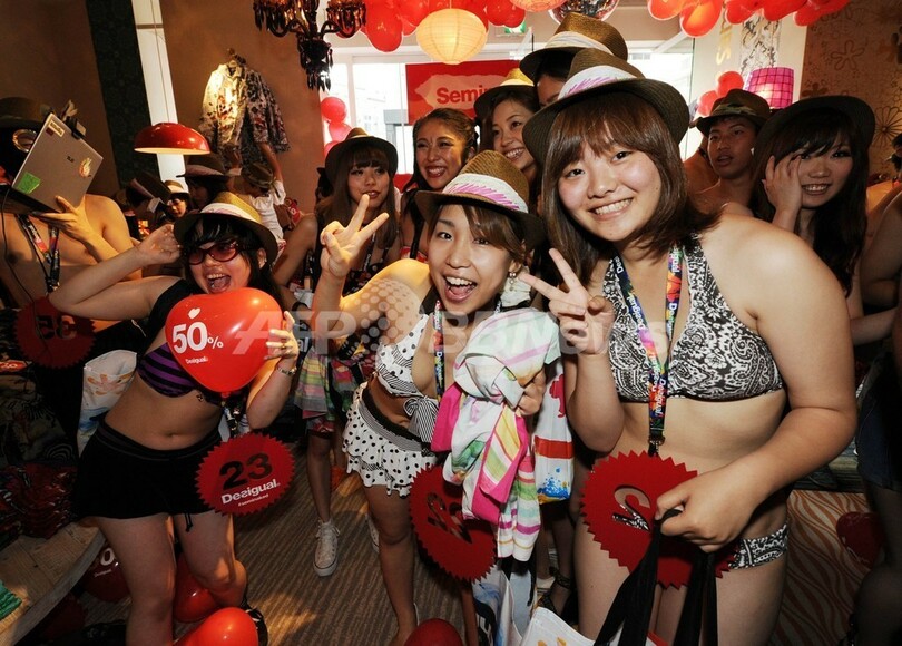 【6月24日 AFP】スペインのカジュアルファッションブランド「デシグアル(Desigual)」原宿店で22日、アジア初となる「セミ・ネイキッド・パーティー」が開催された。このイベントは、水着を着て来店した先着100人に店内の商品2点を無料でプレゼントするもの。店の前には約350人の列ができ、中には前夜から並んだ人も。開店を待つ間、集まった人たちは水着の上に店から提供されたバスローブをはおり、朝食として配られたチュロスや飲み物を楽しんだ。(c)AFP