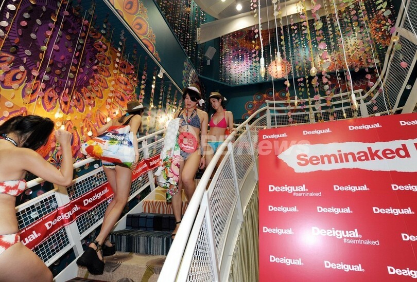 【6月24日 AFP】スペインのカジュアルファッションブランド「デシグアル(Desigual)」原宿店で22日、アジア初となる「セミ・ネイキッド・パーティー」が開催された。このイベントは、水着を着て来店した先着100人に店内の商品2点を無料でプレゼントするもの。店の前には約350人の列ができ、中には前夜から並んだ人も。開店を待つ間、集まった人たちは水着の上に店から提供されたバスローブをはおり、朝食として配られたチュロスや飲み物を楽しんだ。(c)AFP