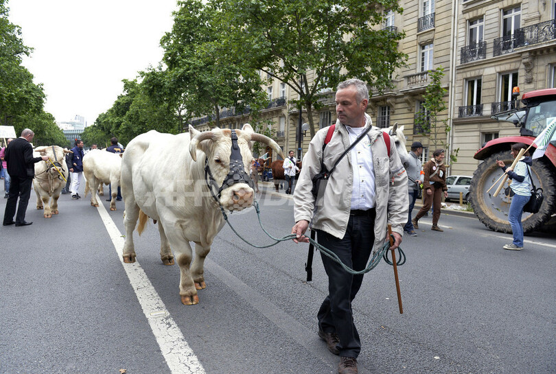 ニュース 政治・経済 羊や牛も行進、畜産農家が業界の実情訴える集会 パリ 2013年6月24日 15:10 発信地:パリ/フランス [ ヨーロッパ フランス ] このニュースをシェア ‹ › ❮ 24/25 ❯ フランスの首都パリ(Paris)で23日、仏全国農業経営者組合連盟(FNSEA)などが主催する集会が開かれ、全国から集まった畜産農家が仕事の実情や困難さをを訴えた。集会では、農家が連れてきた羊や牛などの家畜がパリ市街を練り歩いた(2013年6月23日撮影)。(c)AFP/MIGUEL MEDINA 画像作成中 ! 【6月24日 AFP】フランスの首都パリ(Paris)で23日、仏全国農業経営者組合連盟(FNSEA)などが主催する集会が開かれ、全国から集まった畜産農家が仕事の実情や困難さをを訴えた。集会では、農家が連れてきた羊や牛などの家畜がパリ市街を練り歩いた。(c)AFP 政治・経済 一覧へ> メディア・報道関係・法人の方向け 写真・動画 購入のお問合せ>