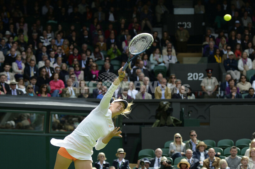 サーブを放つマリア・シャラポワ(2013年6月24日撮影)。(c)AFP/ADRIAN DENNIS