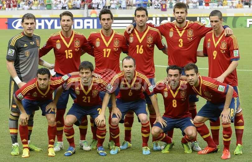 試合前の写真撮影に臨むスペインの選手(2013年6月27日撮影)。(c)AFP/LLUIS GENE