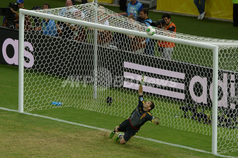 イタリアのレオナルド・ボヌッチ(Leonardo Bonucci)のPKに反応するスペインのGKイケル・カシージャス(Iker Casillas、2013年6月27日撮影)。(c)AFP/YASUYOSHI CHIBA