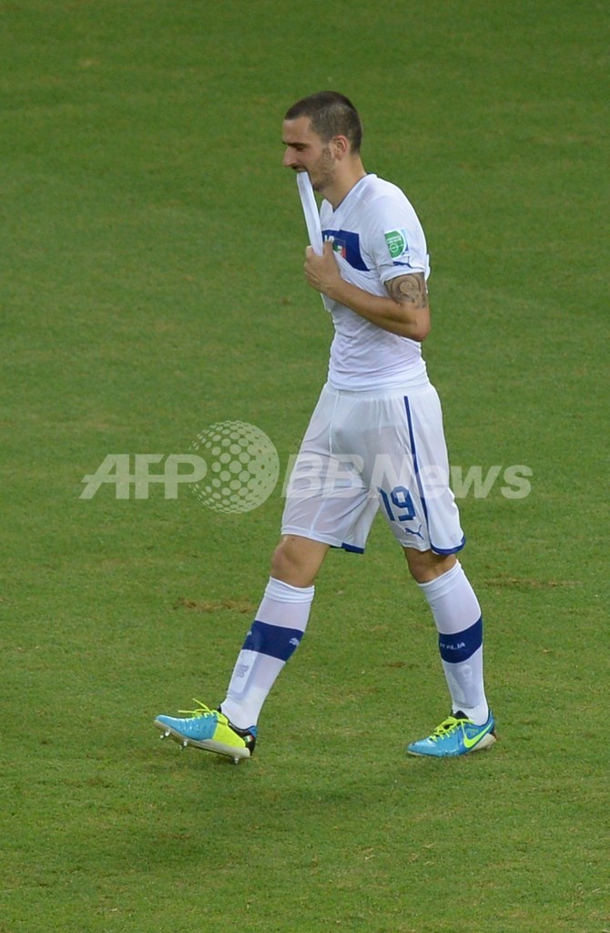 PKを外し落胆した様子を見せるイタリアのレオナルド・ボヌッチ(Leonardo Bonucci、2013年6月27日撮影)。(c)AFP/YASUYOSHI CHIBA