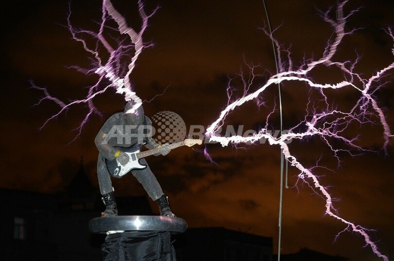 【6月28日 AFP】中国福建(Fujian)省福州(Fuzhou)市郊外の村で24日、地元のバンド「ライトニングファン(Lightningfan)」が、テスラコイルを使い雷を発生させながら演奏するパフォーマンスを行った。