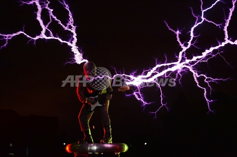 【6月28日 AFP】中国福建(Fujian)省福州(Fuzhou)市郊外の村で24日、地元のバンド「ライトニングファン(Lightningfan)」が、テスラコイルを使い雷を発生させながら演奏するパフォーマンスを行った。