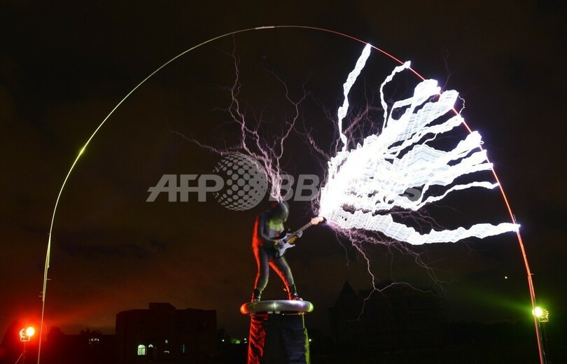 【6月28日 AFP】中国福建(Fujian)省福州(Fuzhou)市郊外の村で24日、地元のバンド「ライトニングファン(Lightningfan)」が、テスラコイルを使い雷を発生させながら演奏するパフォーマンスを行った。