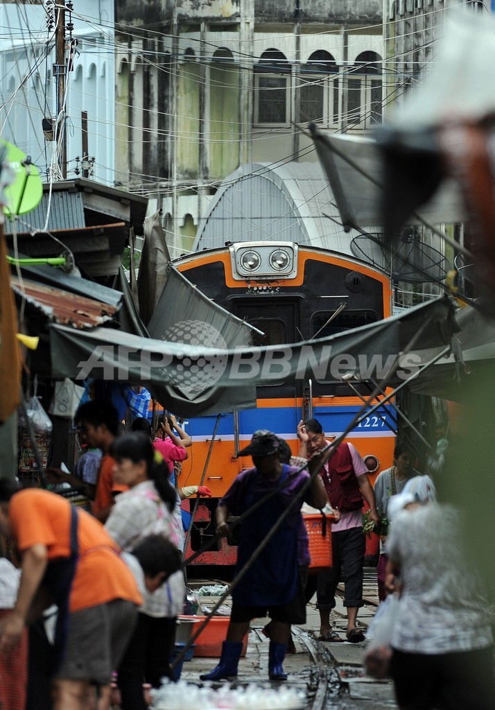 1日に数回、列車が通るたびに露天商らは急いで張り出したテント屋根を引っ込め、列車が通した後に再び野菜や魚、卵といった商品を線路に沿って並べ直す。市場の客たちも、通路となっている線路の上に戻って買い物を続ける。日常的に繰り広げられるこの光景を一目見ようと、メークロン市場には毎日、カメラを手にした観光客らが大勢やって来る。(c)AFP/Christophe ARCHAMBAULT