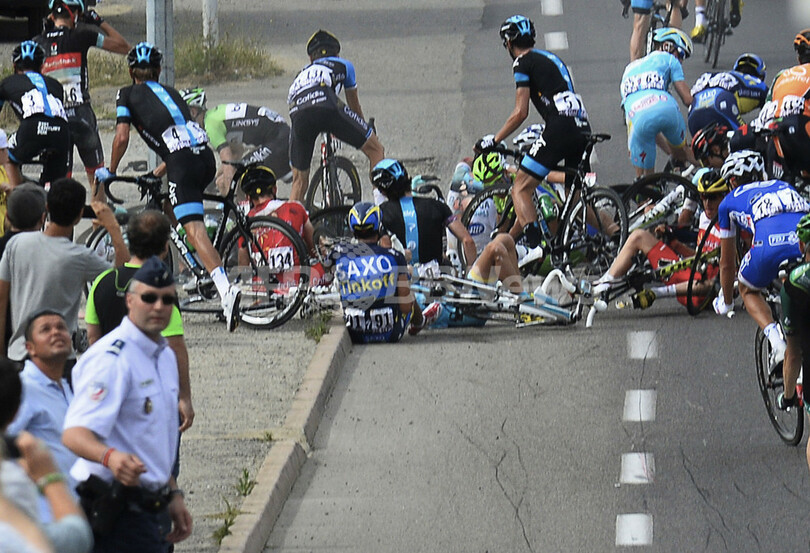 ヴァカンソレイユDCMのジョニー・フーガーランド(Johnny Hoogerland、オランダ)が広告に当たって倒れたのを筆頭に、有力選手ではチーム・サクソ・ティンコフ(Team Saxo-Tinkoff)のアルベルト・コンタ ドール(Alberto Contador、スペイン)、キャノンデール・プロ(Cannondale Pro)のペーター・サガン(Peter Sagan、スロバキア)らがクラッシュに巻き込まれた。