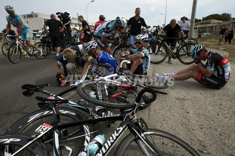 クラッシュに巻き込まれる選手(2013年6月29日撮影)。(c)AFP/JOEL SAGET