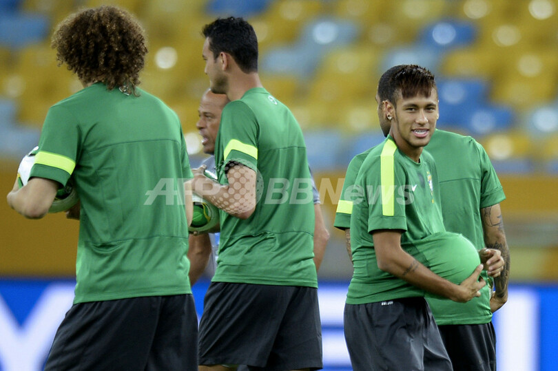 調整に臨むブラジルのネイマール(Neymar da Silva Santos Junior、右、2013年6月29日撮影)。(c)AFP/LLUIS GENE