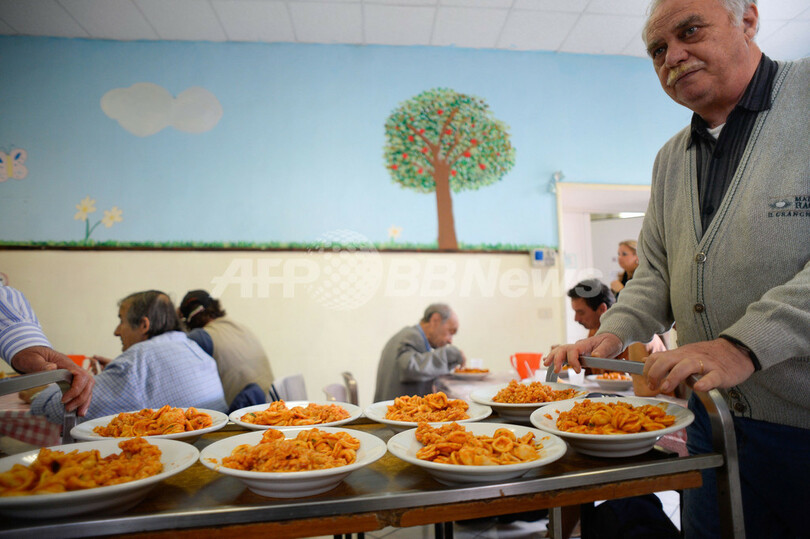 【7月3日 AFP】イタリアの首都ローマ(Rome)の、あるうらぶれた地区の無料食堂では、有名レストランや高級惣菜店から寄付された美味しい料理を配給している。廃棄される食品を減らし、不況に見舞われているイタリアで困窮する人々に食事を提供するための新たな取り組みの一つだ。