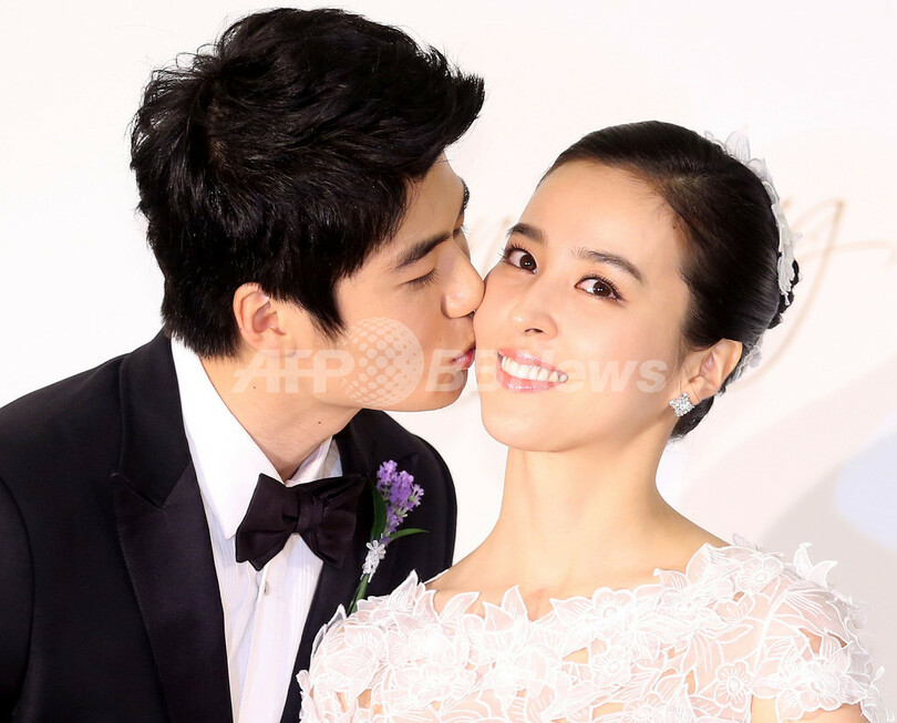 韓国・ソウル(Seoul)のインターコンチネンタルホテル(Intercontinental Hotel)で1日、英プレミアリーグのスウォンジー・シティ(Swansea City)所属の寄誠庸(Ki Sung-Yueng、キ・ソンヨン)選手(24)と女優の韓恵珍(Han Hye-Jin、ハン・へジン、32)の結婚式が行われた。写真は、フォトセッションでポーズをとるキ・ソンヨンとハン・へジン(2013年7月1日撮影)。(c)STARNEWS