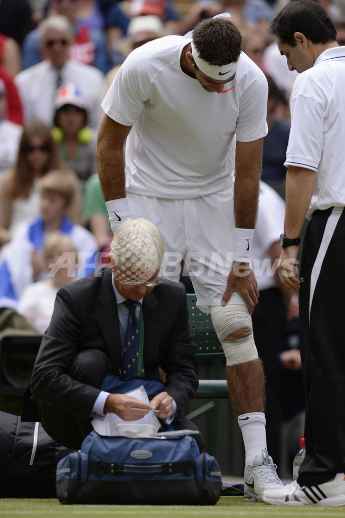 転倒後、治療を受けるファン・マルティン・デルポトロ(2013年7月3日撮影)。(c)AFP/ADRIAN DENNIS
