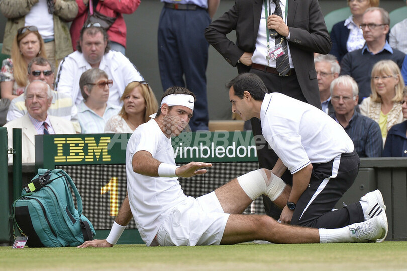 デルポトロは第1セット早々に転倒し、すでに痛めている左膝を不自然な方向に曲げて涙を流した。スロベニアのグレガ・ゼミヤ(Grega Zemlja)との3回戦で負傷していたデルポトロは、転倒した際の痛みがひどく、棄権寸前だったと明かした。