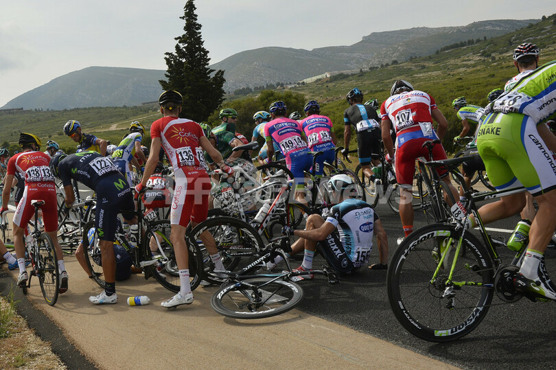 するとゴールから12キロメートルのジネステ(Gineste)峠の頂上でクラッシュが発生し、追走集団の10人以上の選手が落車した。負傷者は出なかったように見えたものの、この影響で第1ステージ勝者のアルゴス・シマノのマルセル・キッテル(Marcel Kittel、ドイツ)、オリカ・グリーンエッジのスプリンター、マシューハーレー・ゴス(Matthew Harley Goss、オーストラリア)らが後れを取った。