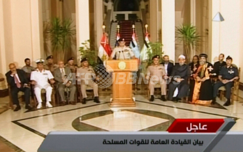 シシ国防相の国営テレビでの発表には、反大統領派連合の代表モハメド・エルバラダイ(Mohamed ElBaradei)氏、コプト教会(Coptic Church)の指導者らや、スンニ派イスラム教の最高権威機関アズハル(Al-Azhar)の幹部らが同席した。(c)AFP/David VUJANOVIC