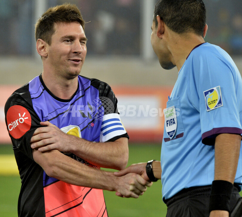 試合前に主審と握手を交わすリオネル・メッシ(2013年7月2日撮影)。(c)AFP/CRIS BOURONCLE