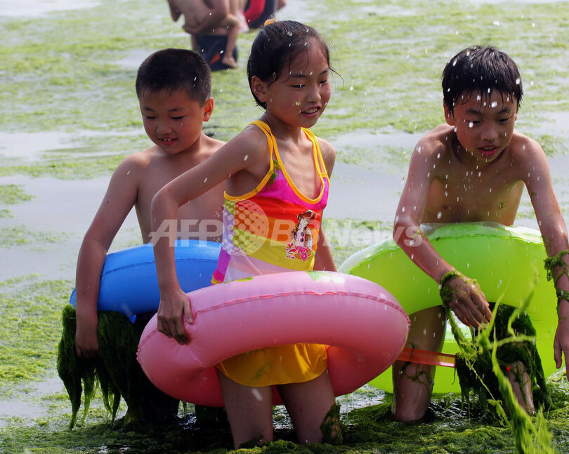 【7月5日 AFP】(写真追加)中国国家海洋局(State Oceanic Administration、SOA)の発表によると、中国近海は過去最大規模の藻の大発生に見舞われており、大量の藻が漂う緑色の波が黄海(Yellow Sea)沿岸に打ち寄せているという。