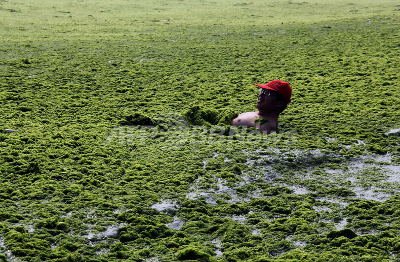【7月5日 AFP】(写真追加)中国国家海洋局(State Oceanic Administration、SOA)の発表によると、中国近海は過去最大規模の藻の大発生に見舞われており、大量の藻が漂う緑色の波が黄海(Yellow Sea)沿岸に打ち寄せているという。