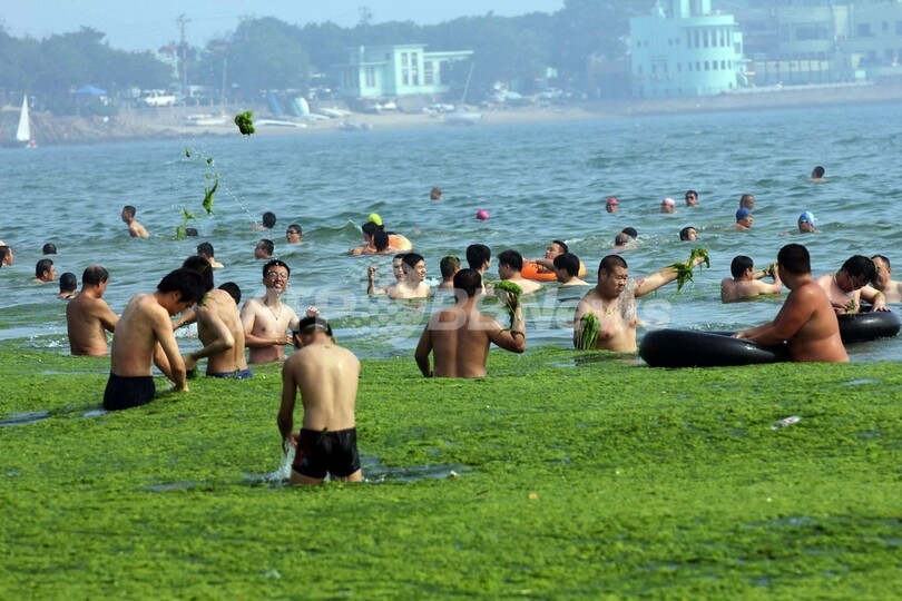 【7月5日 AFP】(写真追加)中国国家海洋局(State Oceanic Administration、SOA)の発表によると、中国近海は過去最大規模の藻の大発生に見舞われており、大量の藻が漂う緑色の波が黄海(Yellow Sea)沿岸に打ち寄せているという。
