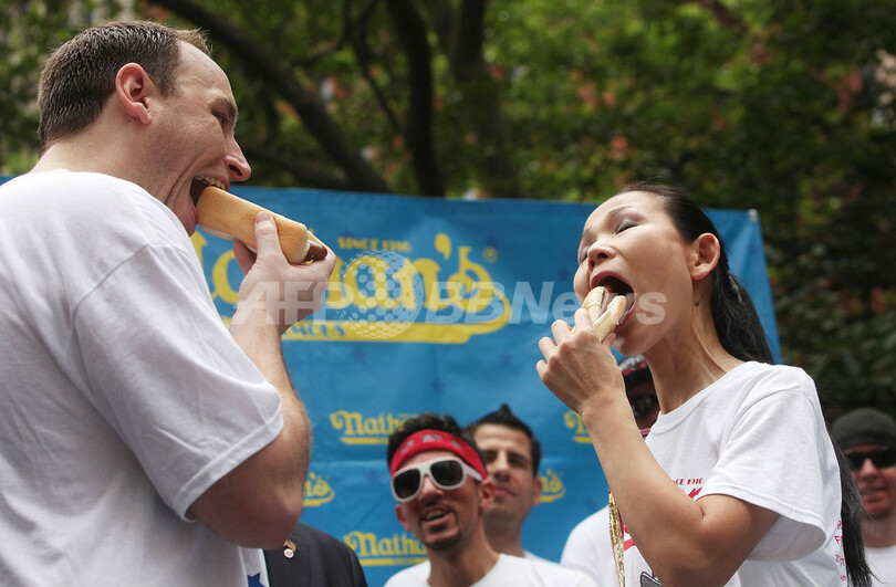写真は、体重測定前にホットドッグをほおばるチェスナットさん(左)と、女子部門優勝のソーニャ・トーマス(Sonya Thomas)さん(2013年7月4日撮影)。(c)AFP/Getty Images/Mario Tama