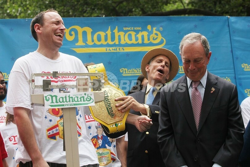 写真は、ニューヨークのマイケル・ブルームバーグ(Michael Bloomberg)市長が見守る中、体重を計測されるチェスナットさん(2013年7月4日撮影)。(c)AFP/Getty Images/Mario Tama