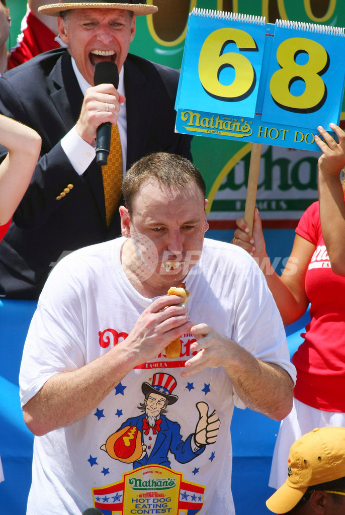 【7月5日 AFP】米独立記念日の4日、ニューヨーク(New York)州コニーアイランド(Coney Island)で毎年恒例の「ネイサンズ国際ホットドッグ早食い選手権(Nathan's Hot Dog Eating Contest)」が行われ、「ジョーズ(Jaws、顎)」ことジョーイ・チェスナット(Joey Chestnut)さんが69個のホットドッグを10分で完食し、昨年打ち立てた68個の自己最高記録を更新して7回目の優勝を果たした。