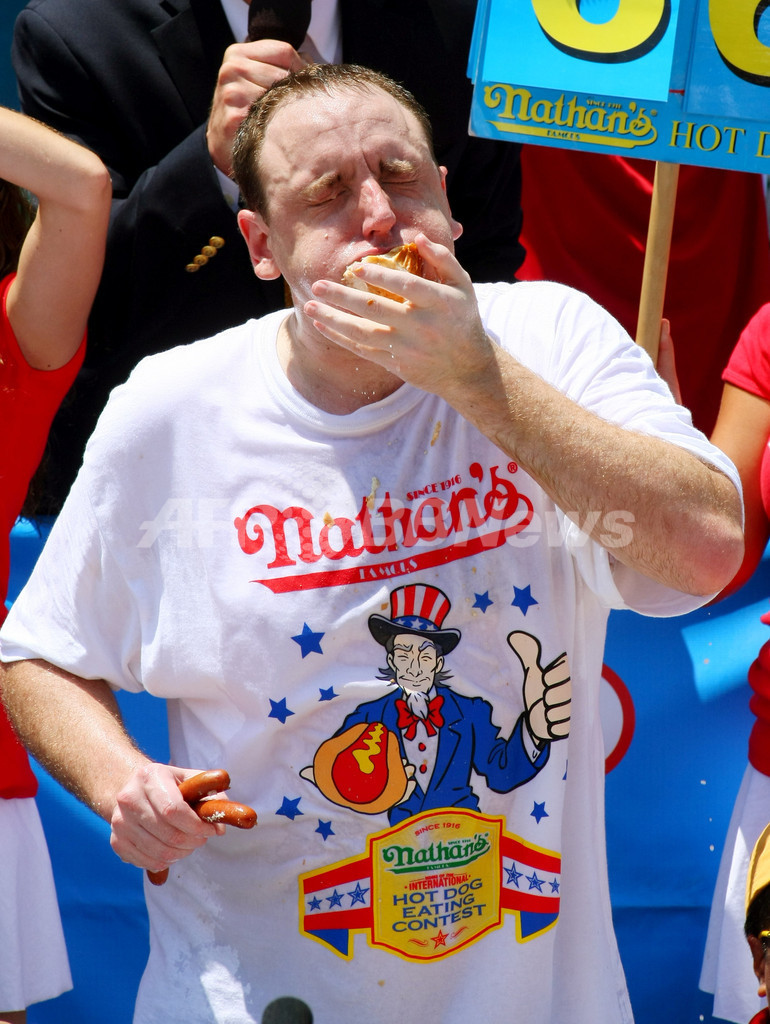 【7月5日 AFP】米独立記念日の4日、ニューヨーク(New York)州コニーアイランド(Coney Island)で毎年恒例の「ネイサンズ国際ホットドッグ早食い選手権(Nathan's Hot Dog Eating Contest)」が行われ、「ジョーズ(Jaws、顎)」ことジョーイ・チェスナット(Joey Chestnut)さんが69個のホットドッグを10分で完食し、昨年打ち立てた68個の自己最高記録を更新して7回目の優勝を果たした。