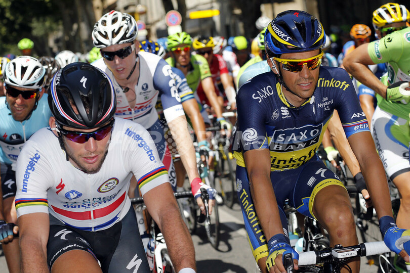 レースに臨むオメガファルマ・クイックステップ(Omega Pharma-Quick Step)のマーク・カヴェンディッシュ(Mark Cavendish、左)とチーム・サクソ・ティンコフ(Team Saxo-Tinkoff)のアルベルト・コンタ ドール(Alberto Contador、2013年7月4日撮影)。(c)AFP/JOEL SAGET