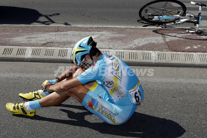 落車して地面に座り込むアスタナ(Astana)のヤネス・ブライコヴィッチ(Janez Brajkovic、2013年7月4日撮影)。(c)AFP/JOEL SAGET