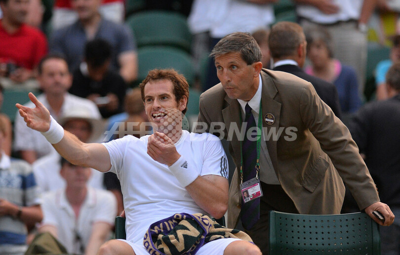 屋根を閉じるために試合が中断することに対し、審判に抗議するアンディ・マレー(2013年7月5日撮影)。(c)AFP/CARL COURT
