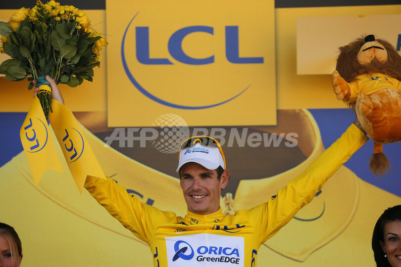 総合首位をキープし、喜ぶオリカ・グリーンエッジ・サイクリングチーム(Orica GreenEDGE Cycling Team)のダリル・インピー(Daryl Impey、2013年7月5日撮影)。(c)AFP/JEFF PACHOUD