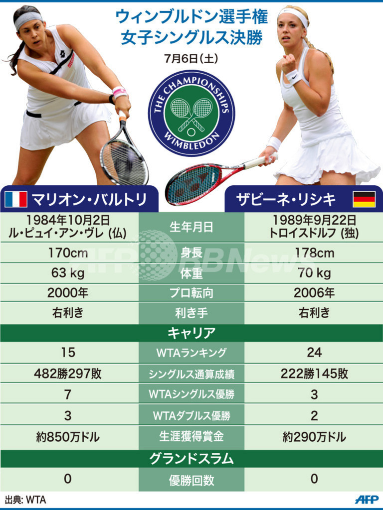 【7月6日 AFP】テニス、ウィンブルドン選手権(The Championships Wimbledon 2013)は6日、大会第15シードのマリオン・バルトリ(Marion Bartoli、フランス)と第23シードのザビーネ・リシキ(Sabine Lisicki、ドイツ)による女子シングルス決勝が行われる。