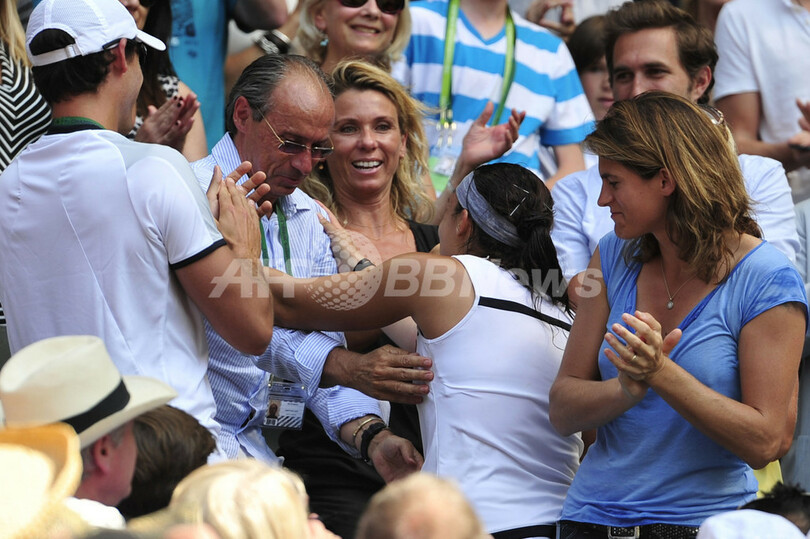 父親のワルテル・バルトリ(Walter Bartoli)氏(中央左)と喜ぶマリオン・バルトリ(中央右、2013年7月6日撮影)。(c)AFP/GLYN KIRK