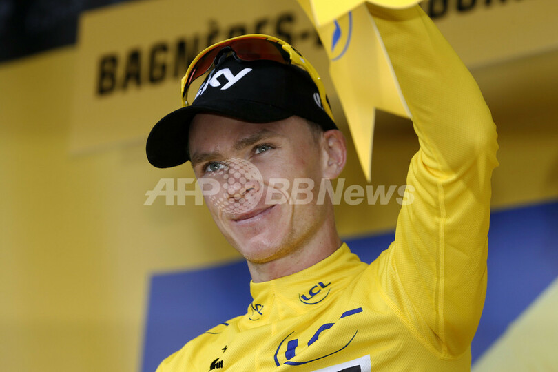 総合首位を守り、表彰台でギャラリーの声援に応えるスカイ(Sky Pro Cycling)のクリス・フルーム(Christopher Froome、2013年7月7日撮影)。(c)AFP/PASCAL GUYOT