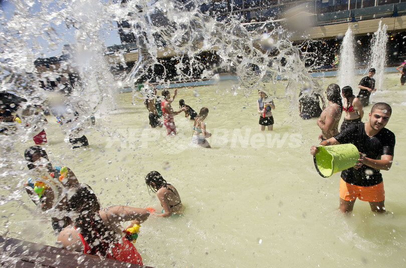 ニュース ライフ こぼれ話 イスラエルで水合戦、外国人観光客も「参戦」 2013年7月8日 8:46 発信地:テルアビブ/イスラエル [ 中東・北アフリカ イスラエル ] このニュースをシェア ‹ › ❮ 6/6 ❯ イスラエル・テルアビブ(Tel Aviv)のラビン広場(Rabin Square)で開催された水合戦で、バケツの水を浴びせ合う人々(2013年7月5日撮影)。(c)AFP/JACK GUEZ 画像作成中 ! 【7月8日 AFP】 イスラエル・テルアビブ(Tel Aviv)のラビン広場(Rabin Square)で5日、今年で9回目となる恒例の水合戦が開催され、地元の人々と外国人観光客が入り交じって水を掛け合う姿がみられた。(c)AFP ライフ 一覧へ> メディア・報道関係・法人の方向け 写真・動画 購入のお問合せ>