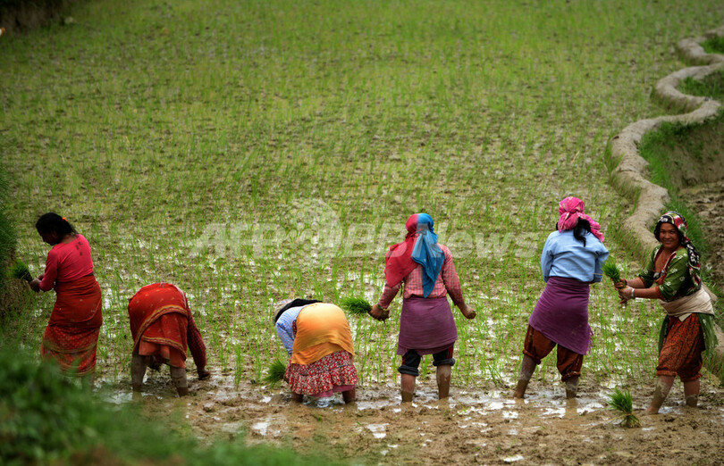 ネパールの田植えシーズンは、モンスーンの季節の到来と共に始まる。同国では人口およそ2700万人のうち約8割が農業に従事している。(c)AFP