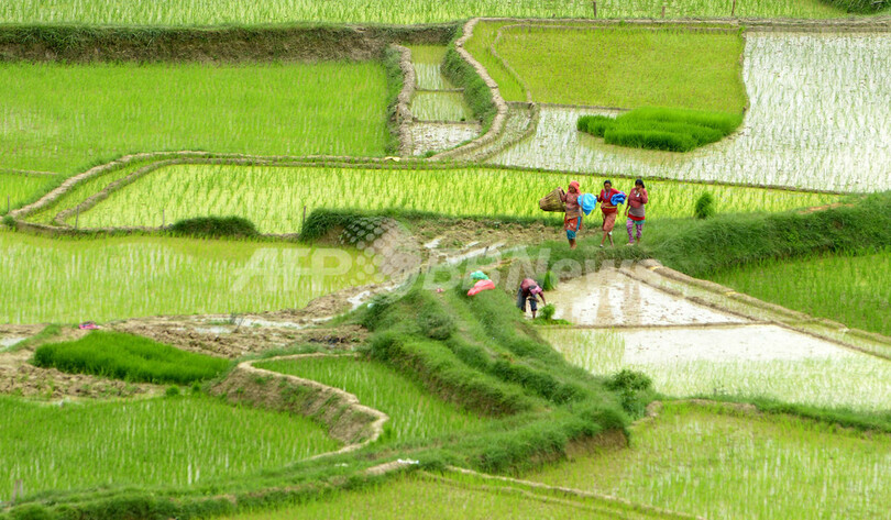 【7月8日 AFP】ネパールの首都カトマンズ(Kathmandu)の近郊、チャング・ナラヤン(Changu Naryan)村で5日、水田で働く農家の人たちの姿が見られた。