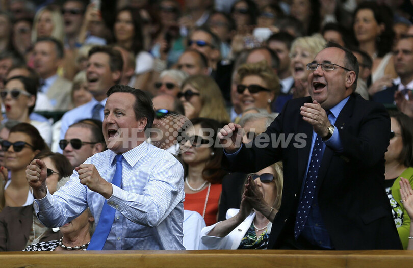 アンディ・マレーの優勝に歓喜する英国のデービッド・キャメロン(David Cameron)首相(左)とスコットランド行政府のアレックス・サモンド(Alex Salmond)首相(2013年7月7日撮影)。(c)AFP/POOL/ANJA NIEDRINGHAUS