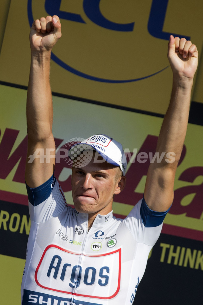 ステージ優勝を飾り、表彰台で両手を突き上げるアルゴス・シマノのマルセル・キッテル(2013年7月9日撮影)。(c)AFP/JEFF PACHOUD