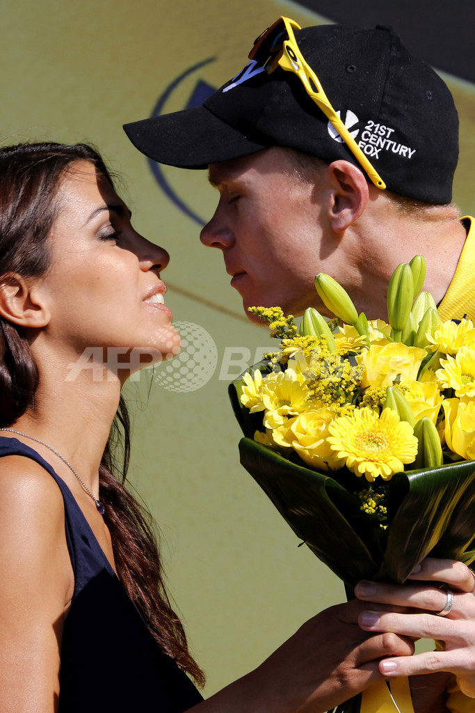総合首位を守り、表彰台キスの祝福を受けるスカイ(Sky Pro Cycling)のクリス・フルーム(Chris Froome、右、2013年7月9日撮影)。(c)AFP/PASCAL GUYOT