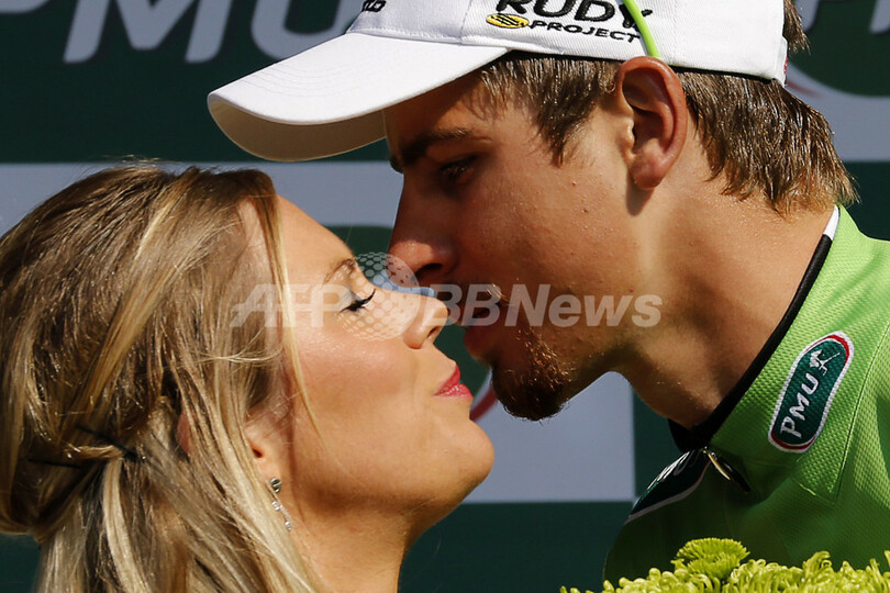 ポイント賞争いで首位を守り、表彰台でキスの祝福を受けるキャノンデール・プロ(Cannondale Pro)のペーター・サガン(Peter Sagan、右、2013年7月9日撮影)。(c)AFP/PASCAL GUYOT