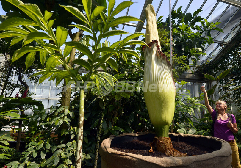 【7月10日 AFP】ベルギーの首都ブリュッセル(Brussels)郊外のメイゼ(Meise)にある国立植物園で7日、世界で最も巨大で珍しく、しかも臭い花の一つ、ショクダイオオコンニャク(学名:Amorphophallus titanum)が、奇妙だが壮観なその姿を現し始めた。原産地のインドネシアでは「死臭を放つ花」、「変形した巨大な男性器」など、さまざまな名前で呼ばれるこの花は、通常では数年置きにしか花をつけないにもかかわらず、今回の開花は過去5年間で3度目という異例の頻度だ。
