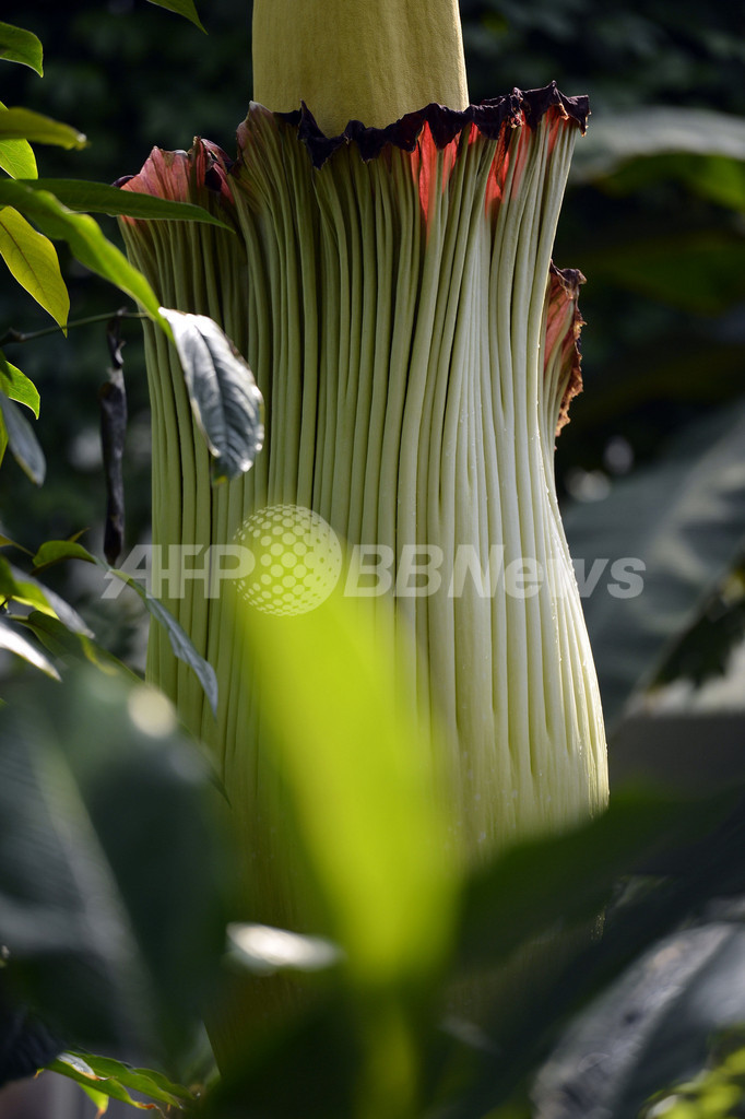 【7月10日 AFP】ベルギーの首都ブリュッセル(Brussels)郊外のメイゼ(Meise)にある国立植物園で7日、世界で最も巨大で珍しく、しかも臭い花の一つ、ショクダイオオコンニャク(学名:Amorphophallus titanum)が、奇妙だが壮観なその姿を現し始めた。原産地のインドネシアでは「死臭を放つ花」、「変形した巨大な男性器」など、さまざまな名前で呼ばれるこの花は、通常では数年置きにしか花をつけないにもかかわらず、今回の開花は過去5年間で3度目という異例の頻度だ。