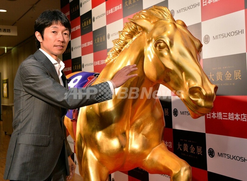 公開イベントには、日本を代表する騎手の武豊(Yutake Take)さんも参加して黄金像に跨がり、懐かしのコンビ姿を披露した。特別展ではその他、総額100億円相当の金製品が展示販売されている(2013年7月11日撮影)。(c)AFP/Yoshikazu TSUNO