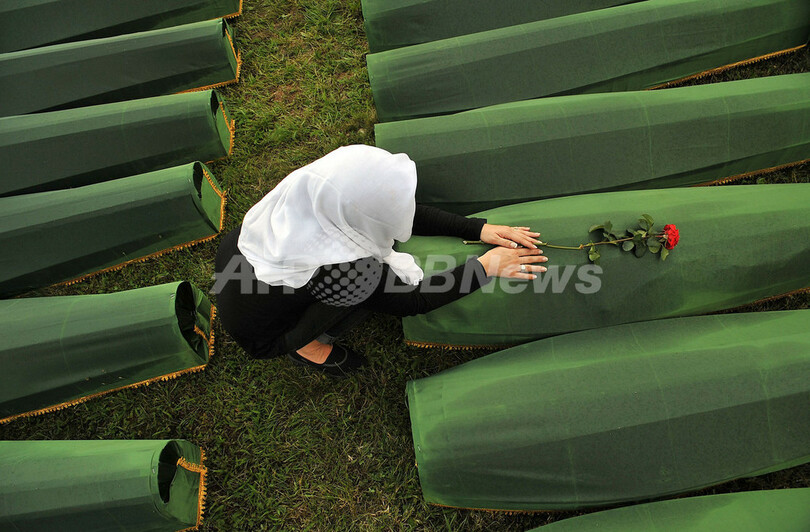 11日は、第2次世界大戦(World War II)後の欧州で最悪の大虐殺とされるこのスレブレニツァの虐殺から18年目に当たる日だった。スレブレニツァではこの日、新たに身元が確認された409人の犠牲者の遺体が再埋葬された。うち1人は、生まれたばかりの赤ちゃんだった。(c)AFP/Jan HENNOP